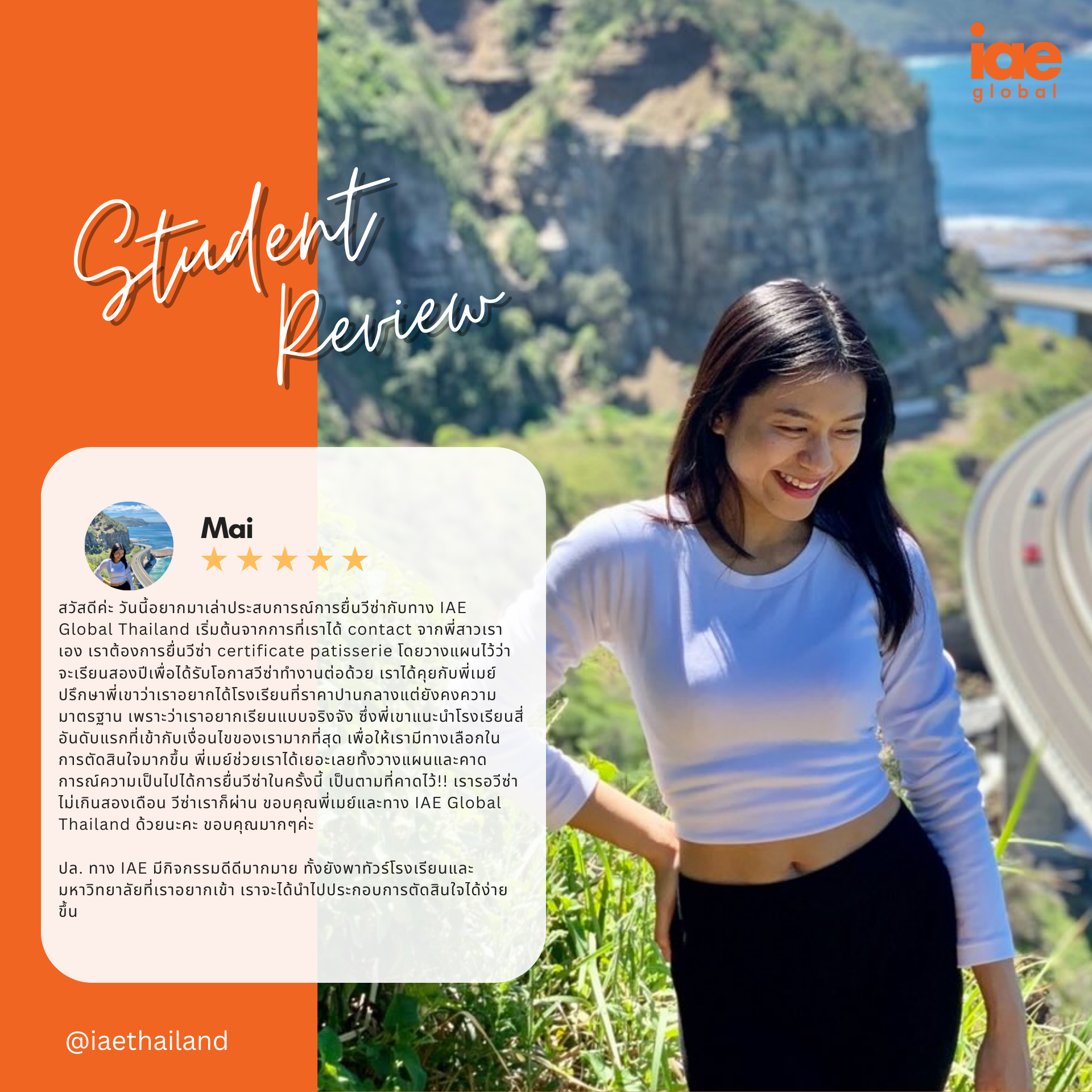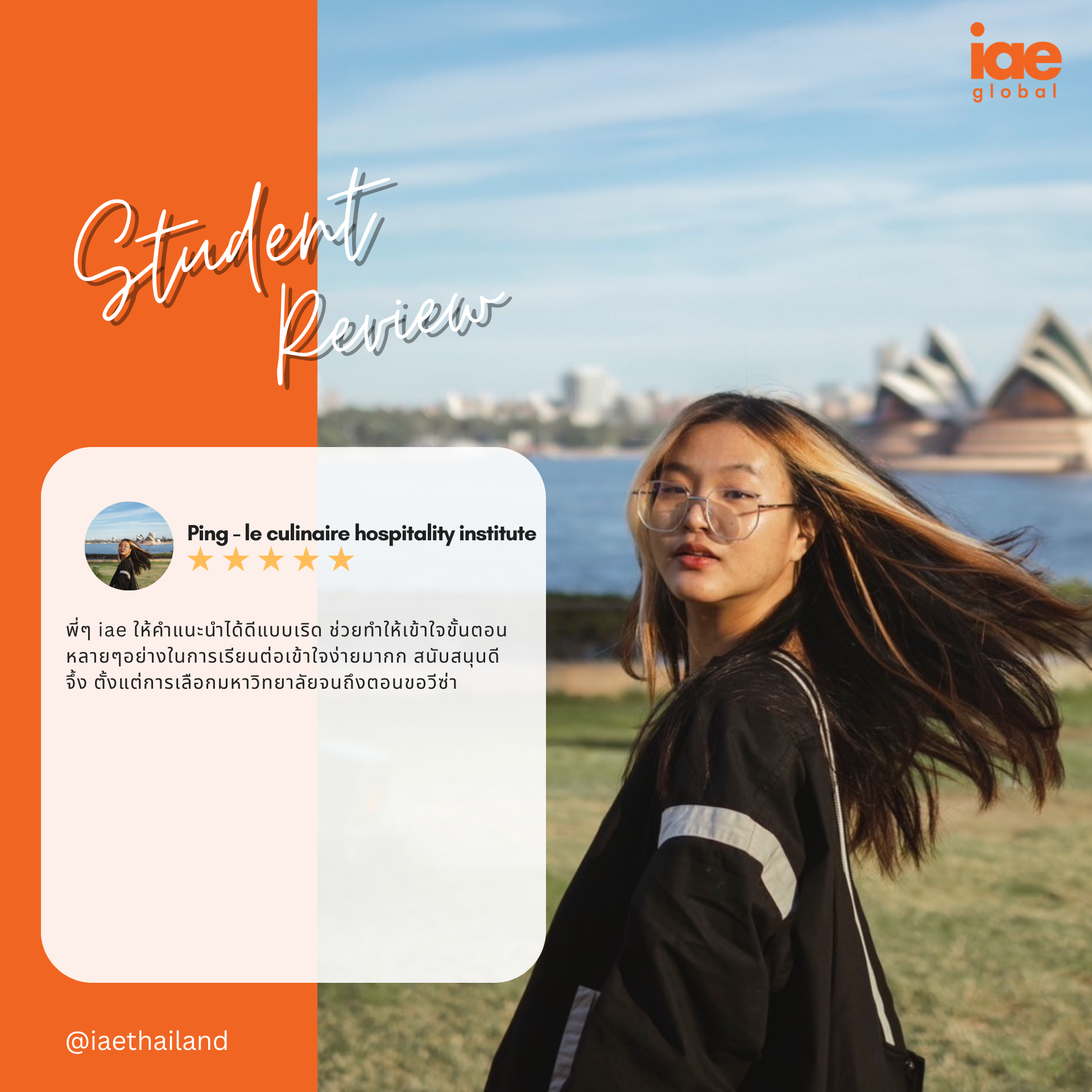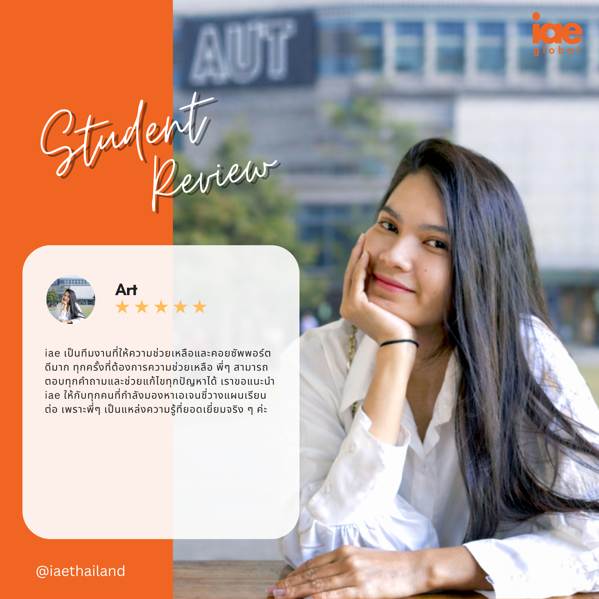 ต้องขอบคุณ iae GLOBAL Thailand ที่ทำให้ฉันประสบความสำเร็จในการจัดการกับความซับซ้อนของการเรียนต่อต่างประเทศ ทีมงานของพวกเขาช่วยให้ฉันได้รับวีซ่าและเข้าศึกษาในมหาวิทยาลัยอันทรงเกียรติ ทั้งหมดนี้พร้อมให้ความช่วยเหลือตลอด 24 ชั่วโมง การอุทิศตนให้กับนักเรียนไม่มีที่ใดเทียบได้ ฉันขอแนะนำ iae GLOBAL ให้กับทุกคนที่ต้องการเรียนต่อต่างประเทศอย่างสุดใจ!
